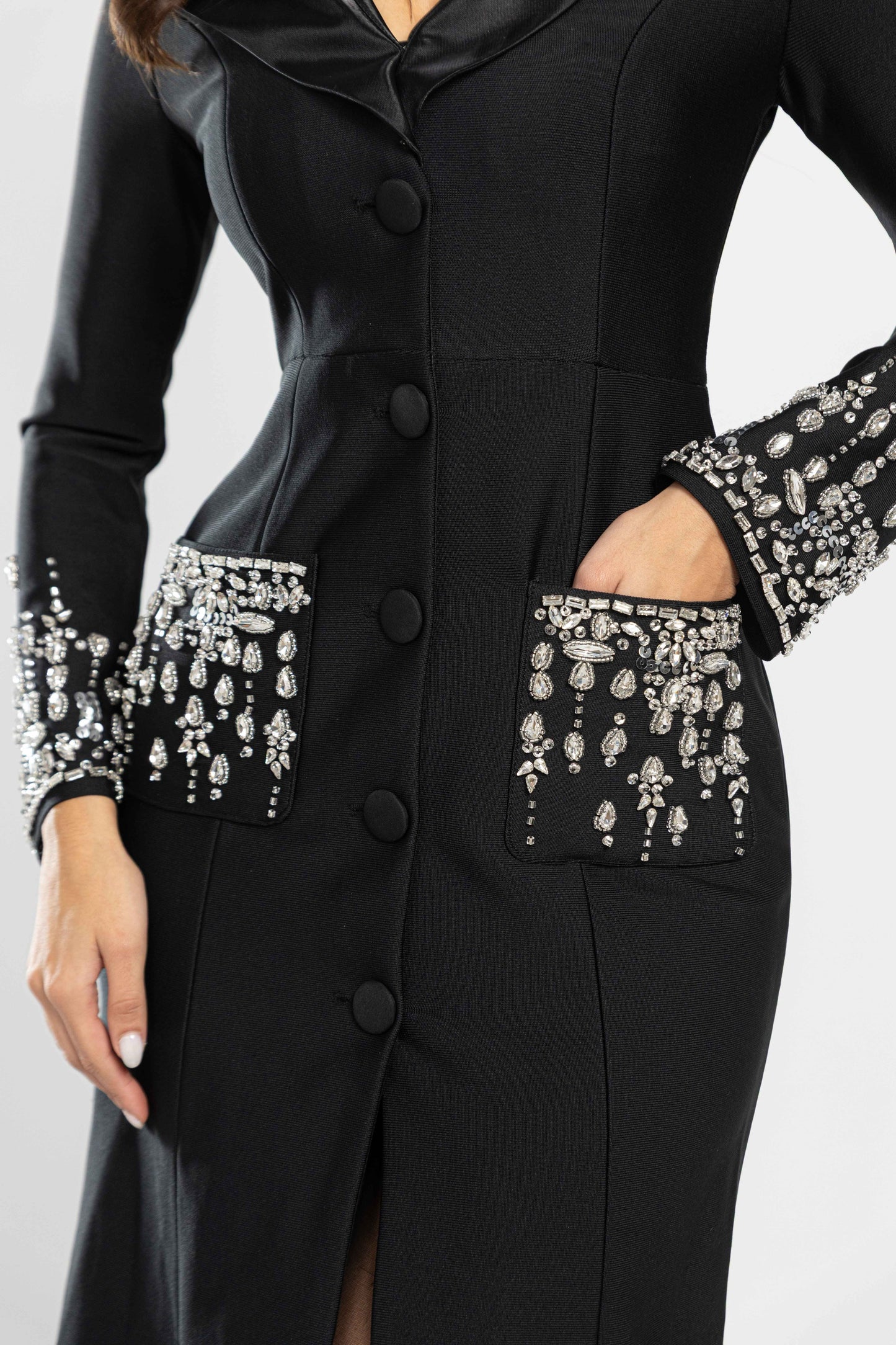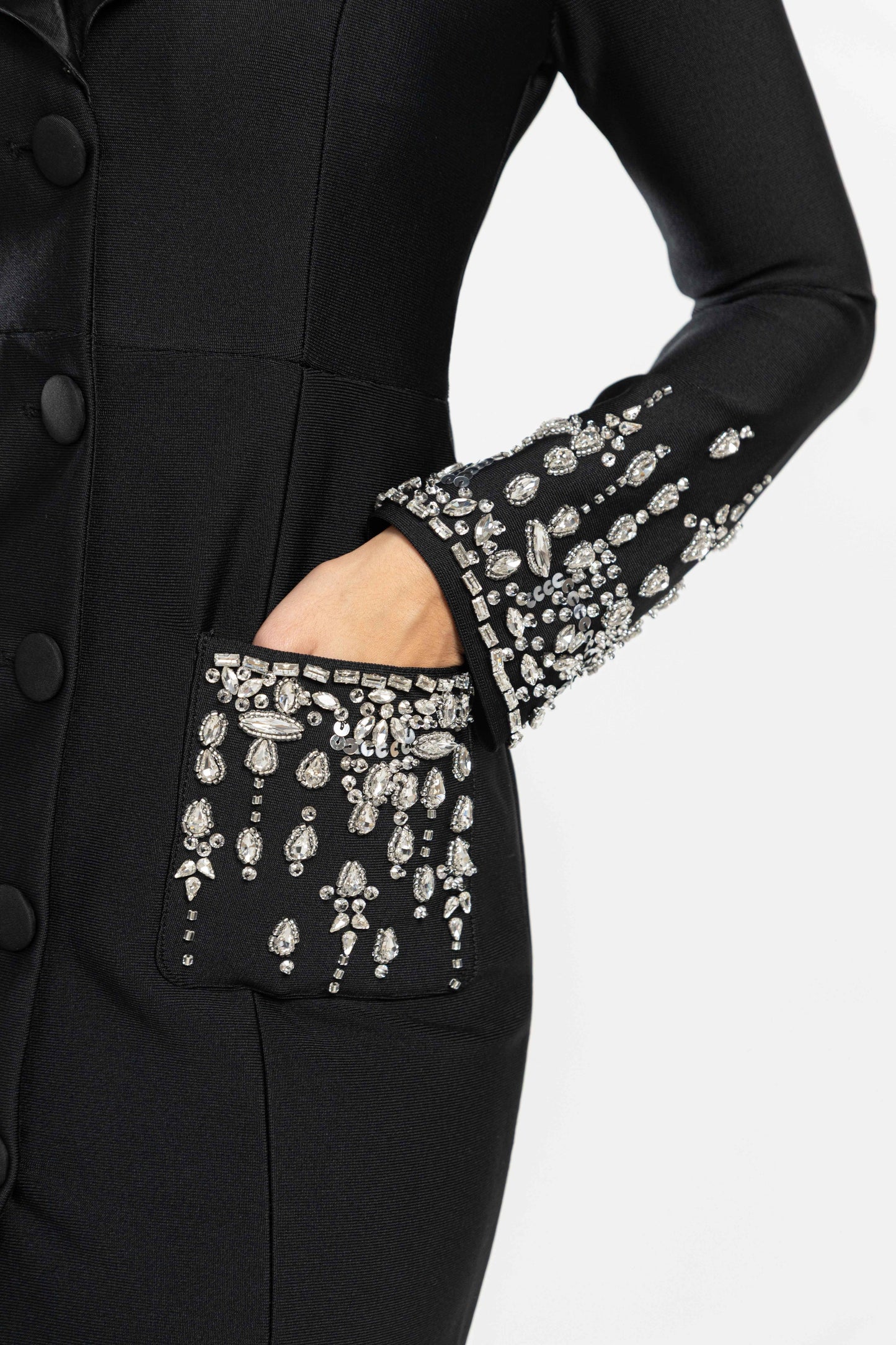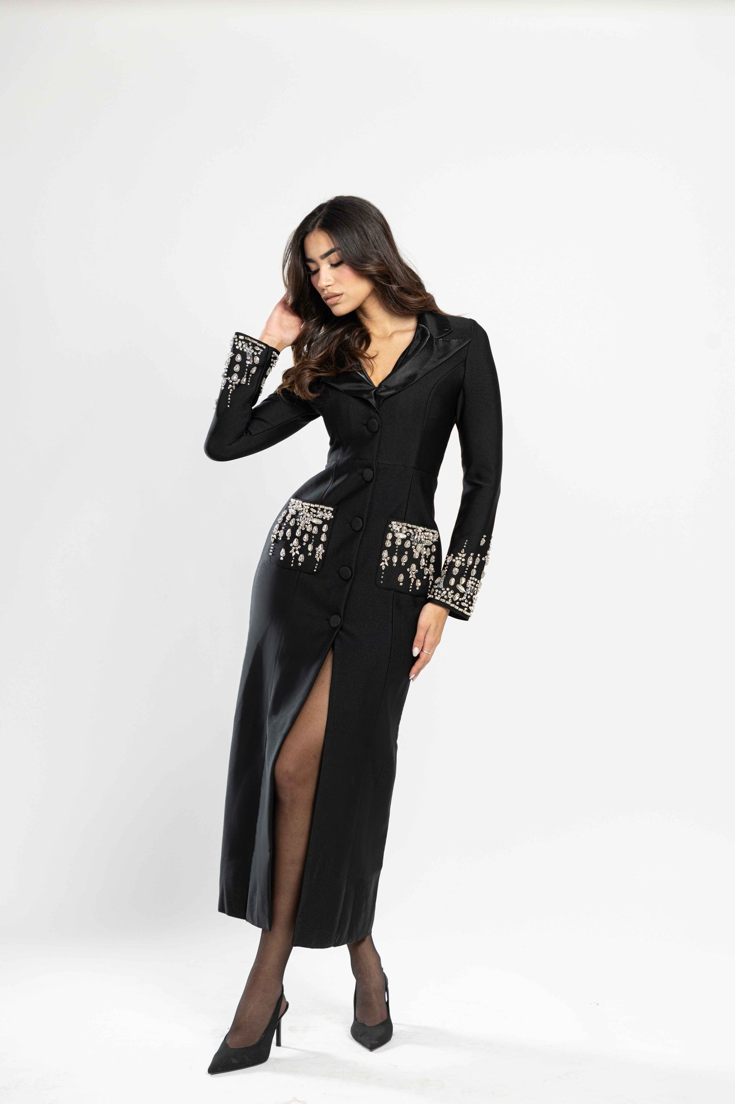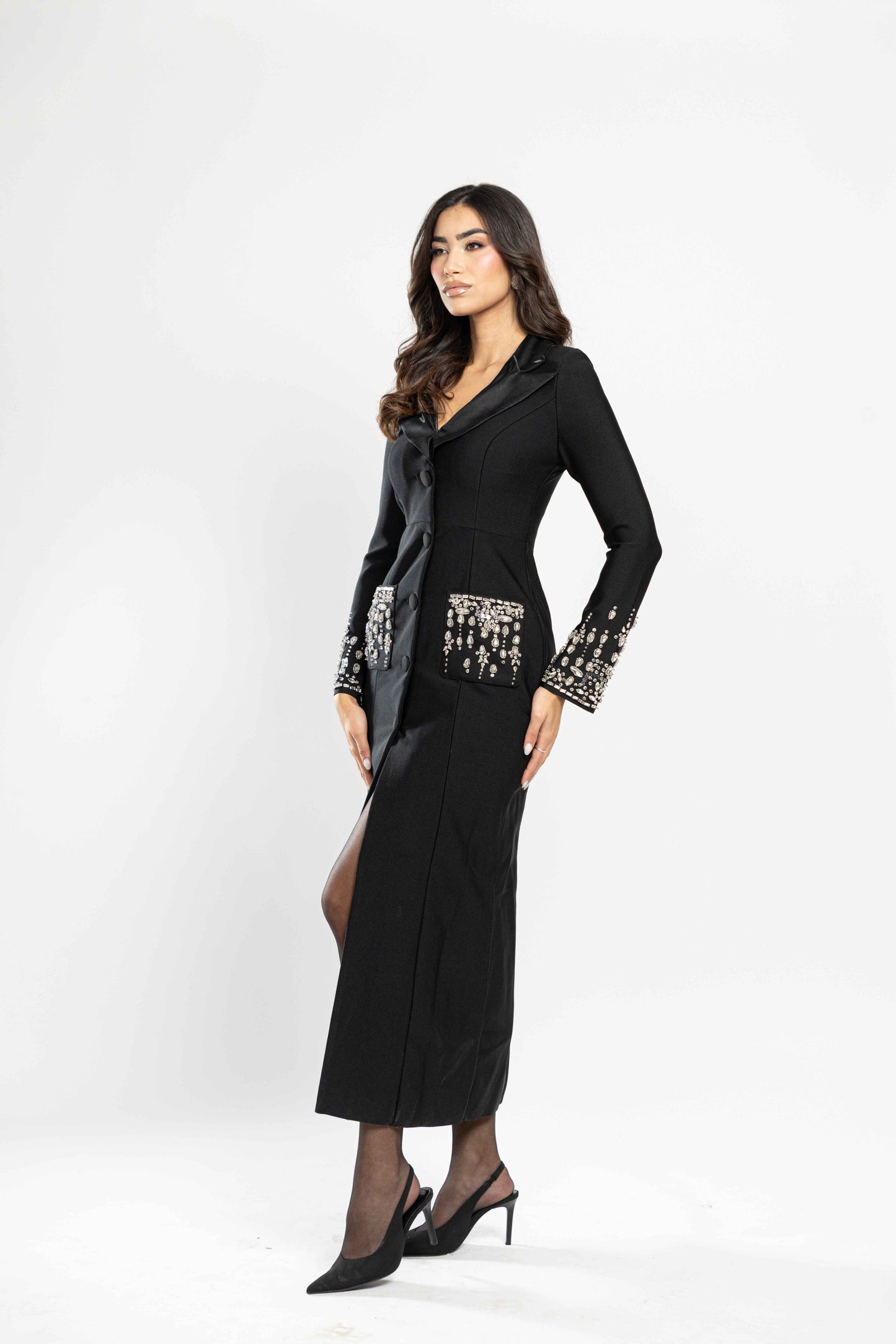 The tailored blazer-inspired top features a sophisticated lapel and striking button front, while the cascading skirt falls to a chic maxi length. Adorned with individually embroidered crystal embellishments on the cuffs and pockets. A daring thigh-high slit adds a bold touch, maintaining versatility for various occasions.