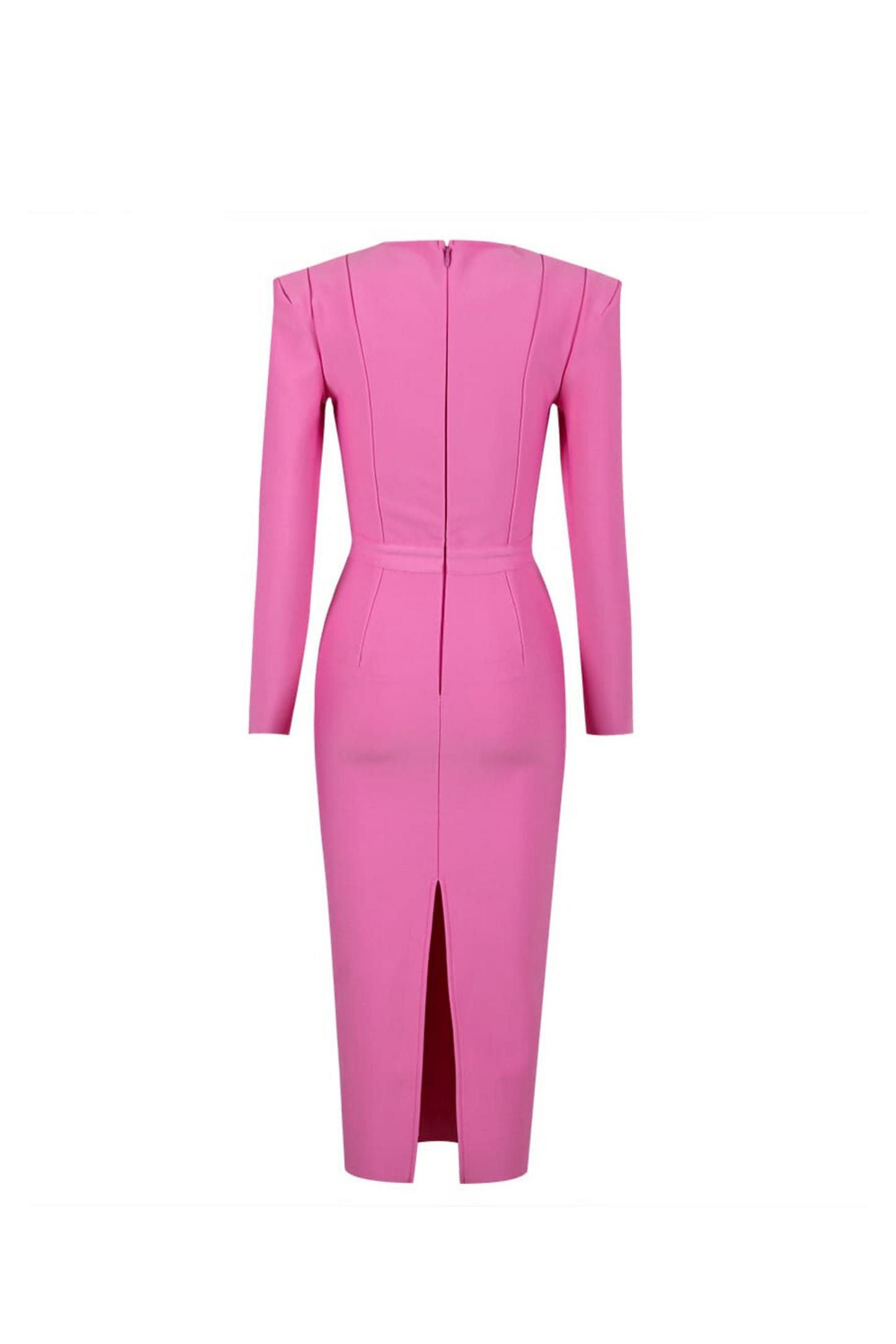The RITA PINK EMBELLISHED MIDI DRESS embodies modern elegance. Featuring a captivating sweetheart neckline, it beautifully highlights your décolletage, while the stretchy crepe fabric ensures a flawless fit. The waistline is exquisitely adorned with pearl and crystal embellishments, adding a touch of opulence and glamour. Thoughtful details like a back slit for ease of movement and a convenient back zipper make it as practical as it is chic. With its midi length and long sleeves, the Rita dress is your perfect choice for occasions demanding confident sophistication.