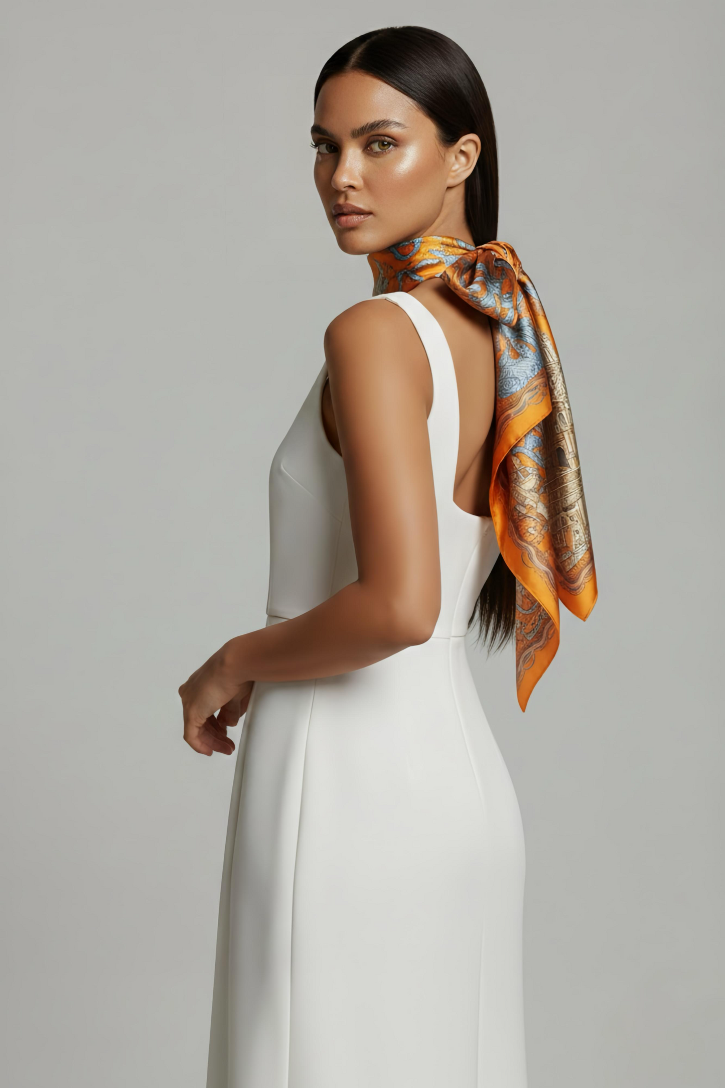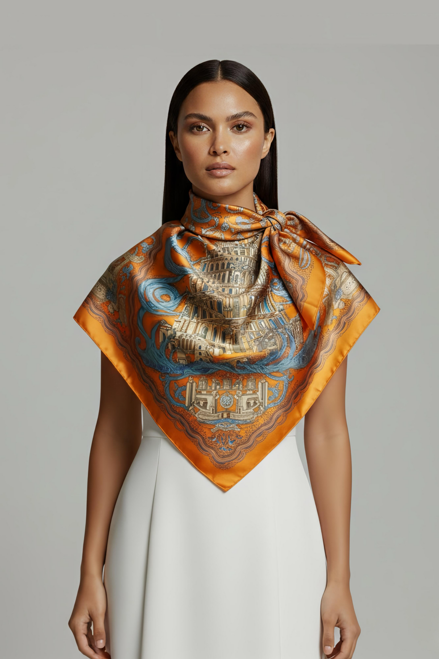 FOULARD EN SOIE IMPRIMÉ BAROQUE DÉTAILS BLEU ORANGE