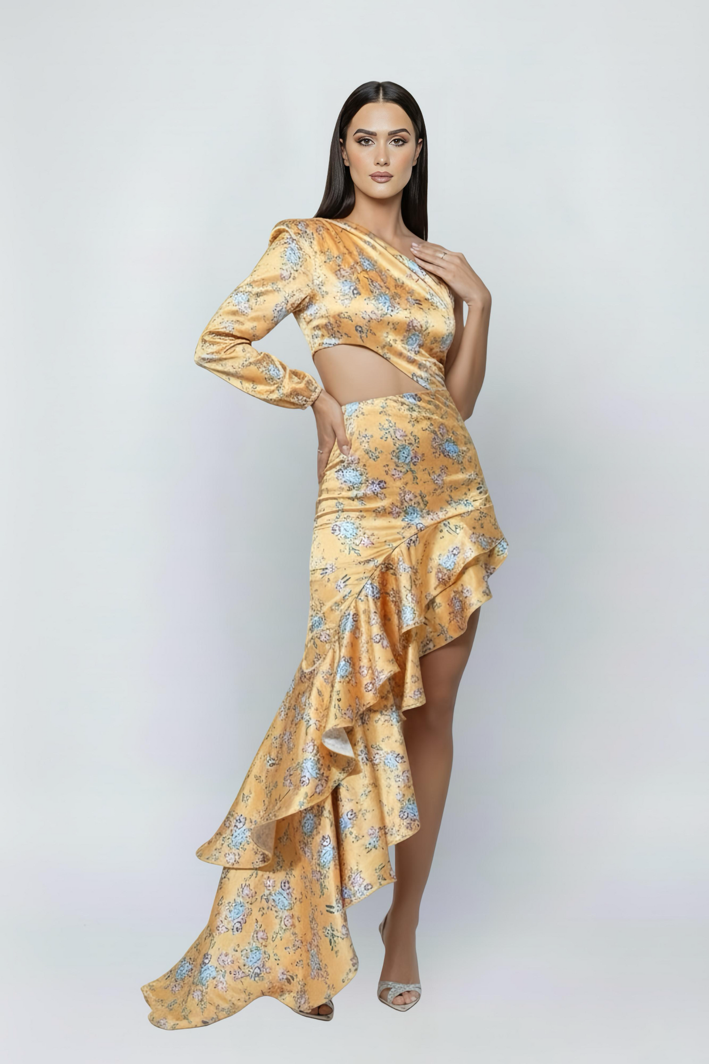 ROBE MAXI FLEURIE À UNE ÉPAULE ROMI JAUNE