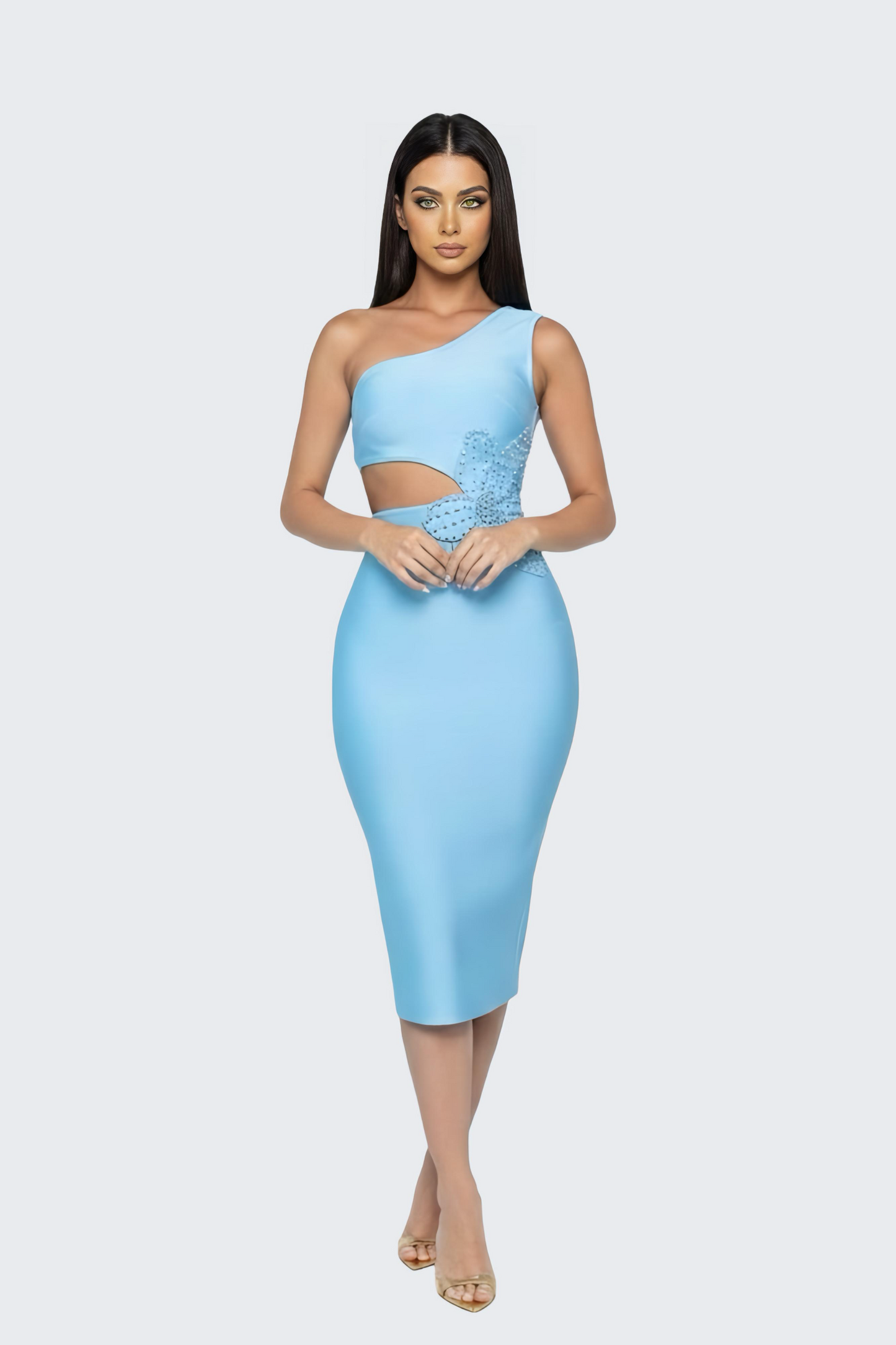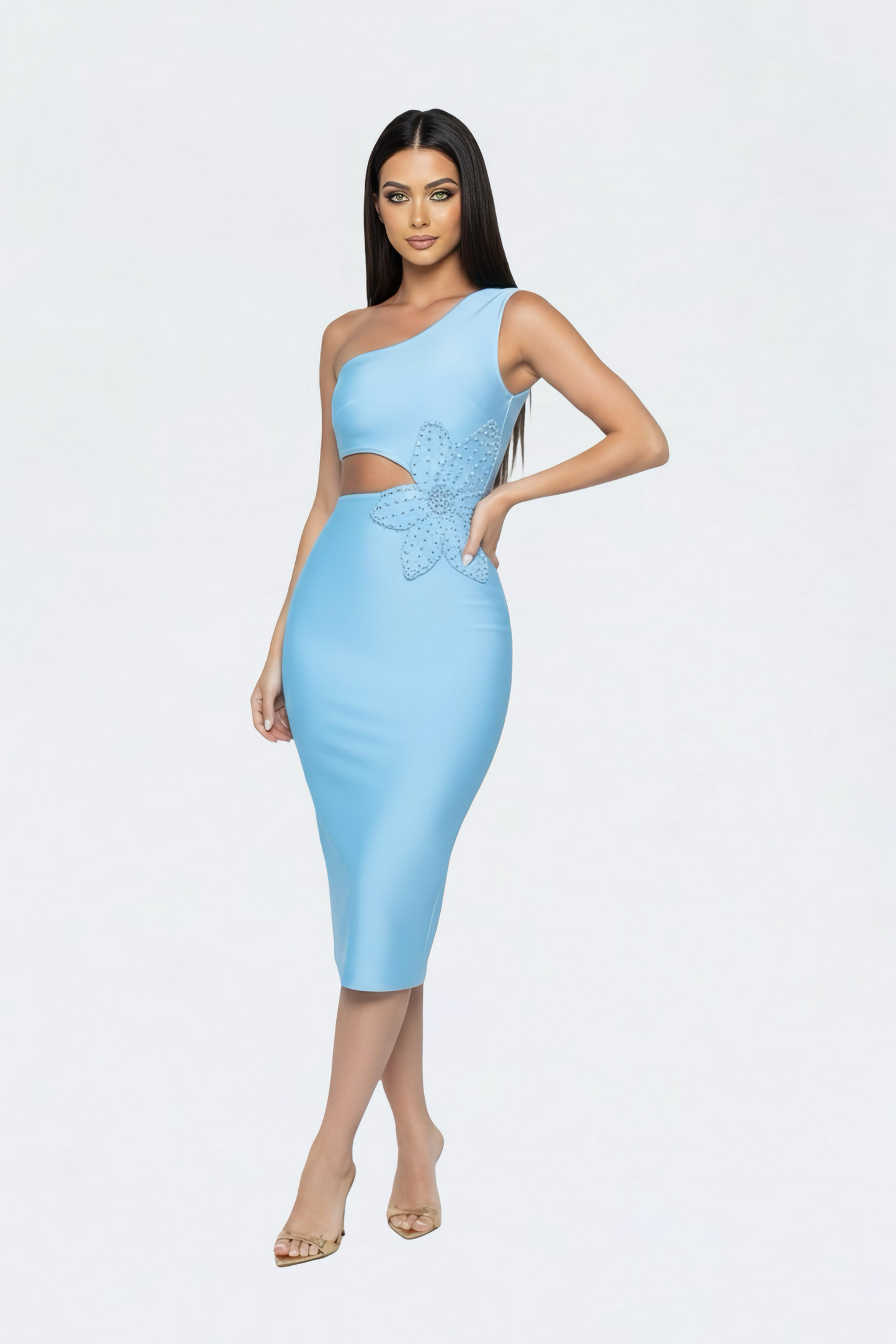 Introducing the Eve Blue Floral One-Shoulder Bandage Dress. This stunning midi dress, in a captivating shade of blue, features a chic one-shoulder design and a daring cutout at the midriff. A delicate floral appliqué adorns the side, adding a touch of feminine charm. The figure-hugging bandage material flatters your silhouette, while a small back slit ensures comfortable movement. Perfect for a special occasion, the Eve dress is designed to turn heads and make you feel effortlessly glamorous.