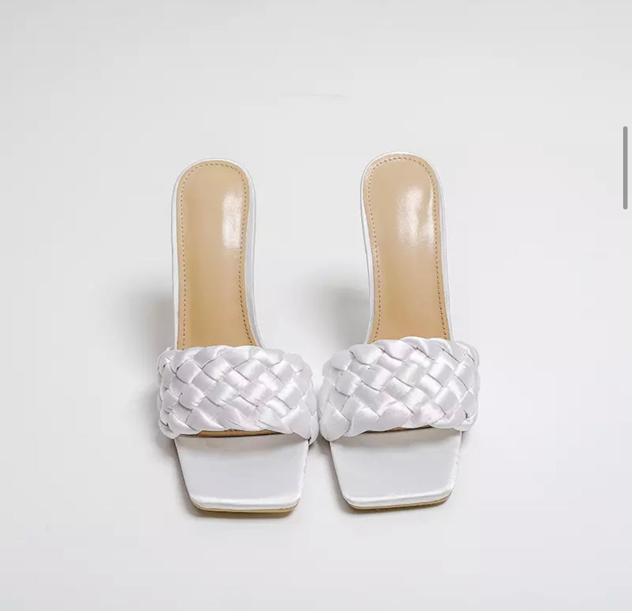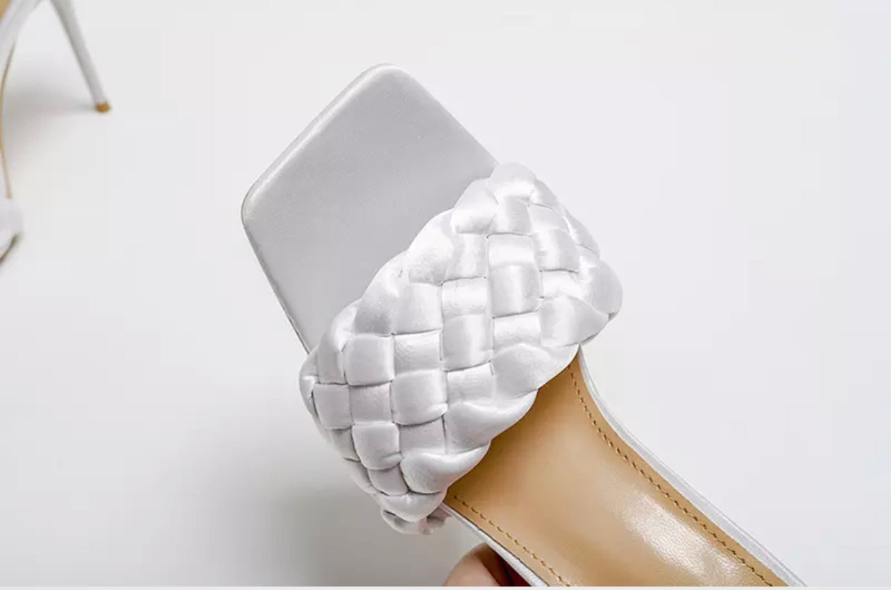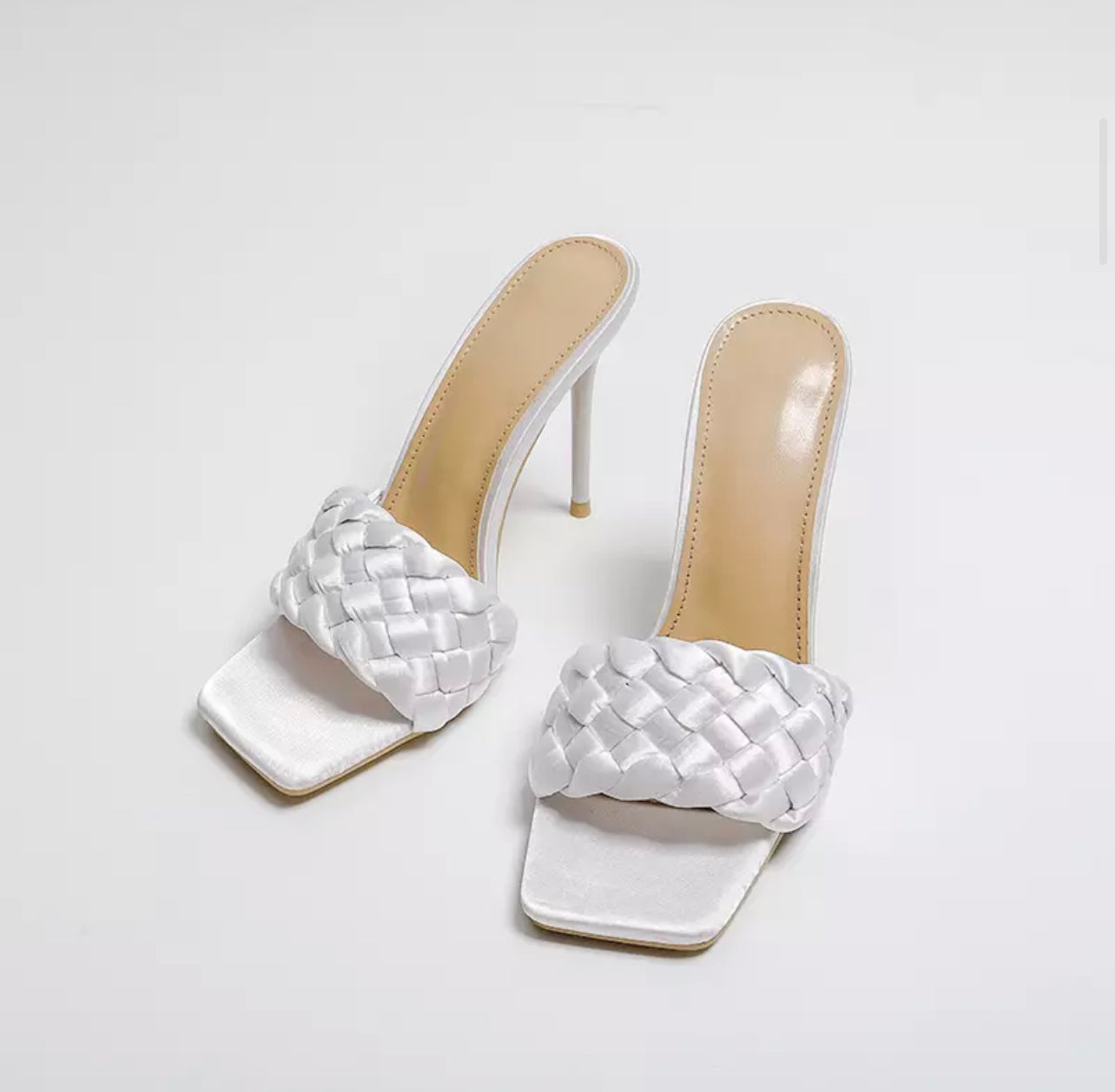 SANDALES À TALONS HAUTS BOUT CARRÉ TRESSÉ EN SATIN BLANC