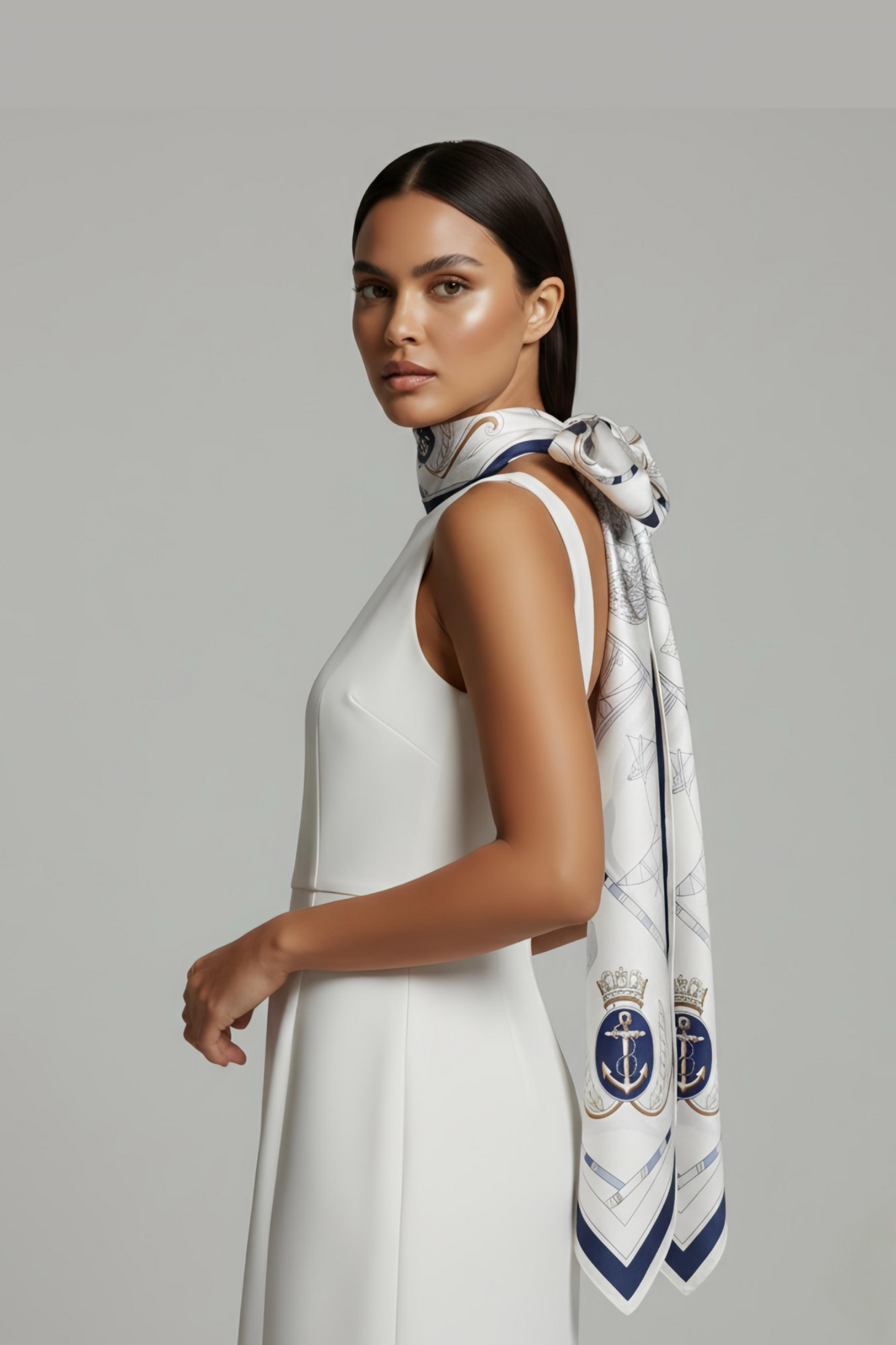 Un imprimé bleu baroque dans un foulard en soie blanche est ce dont vous avez besoin pour accessoiriser n'importe quelle tenue ! Façonné selon une dimension carrée.