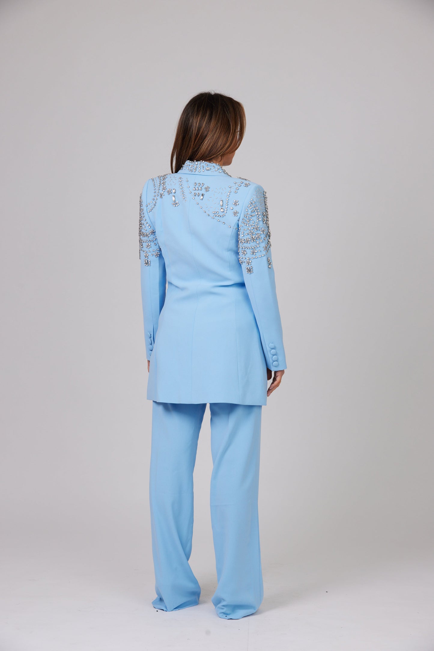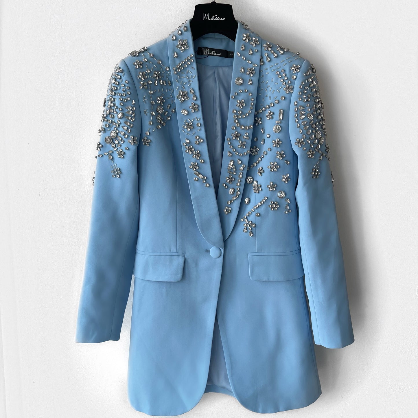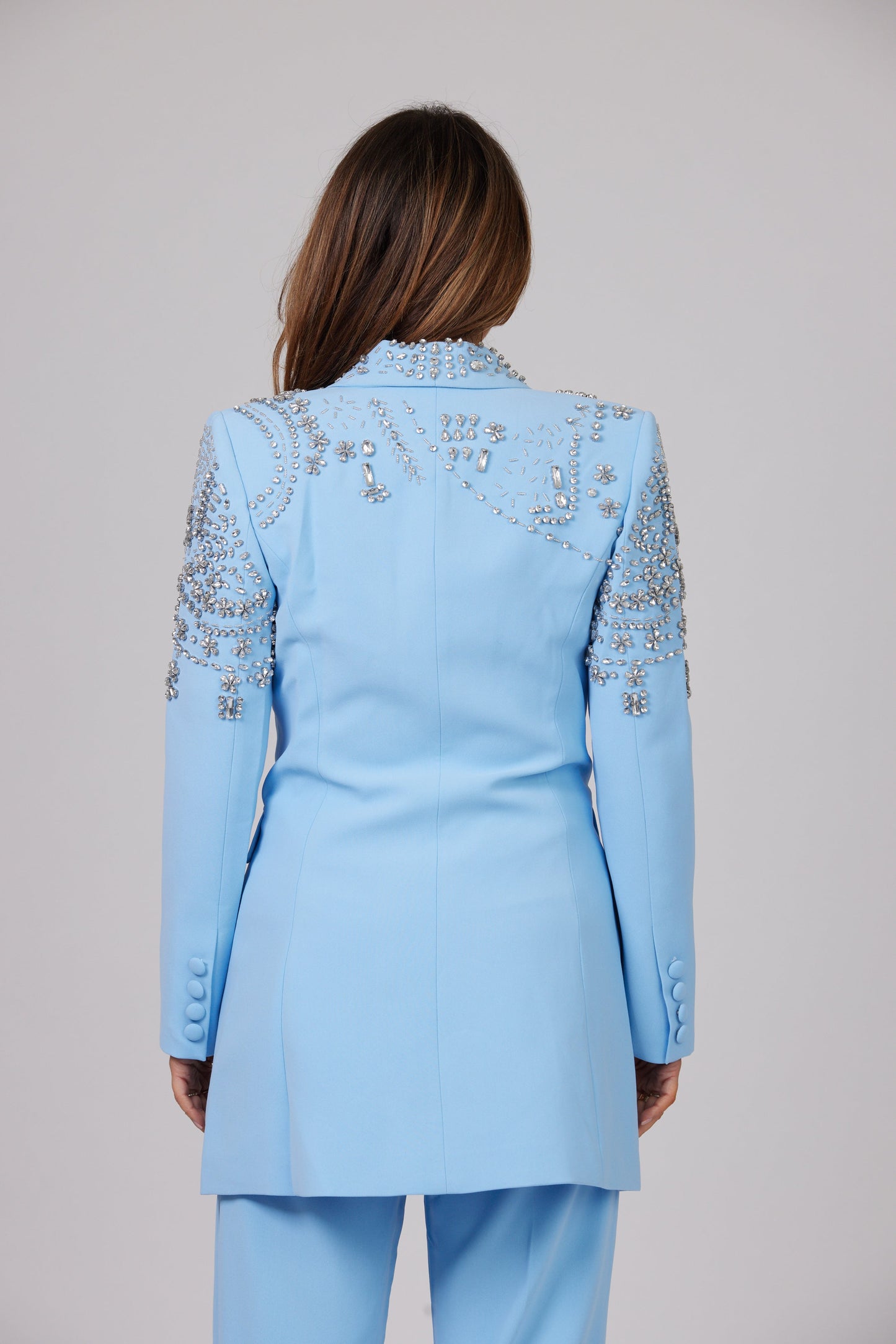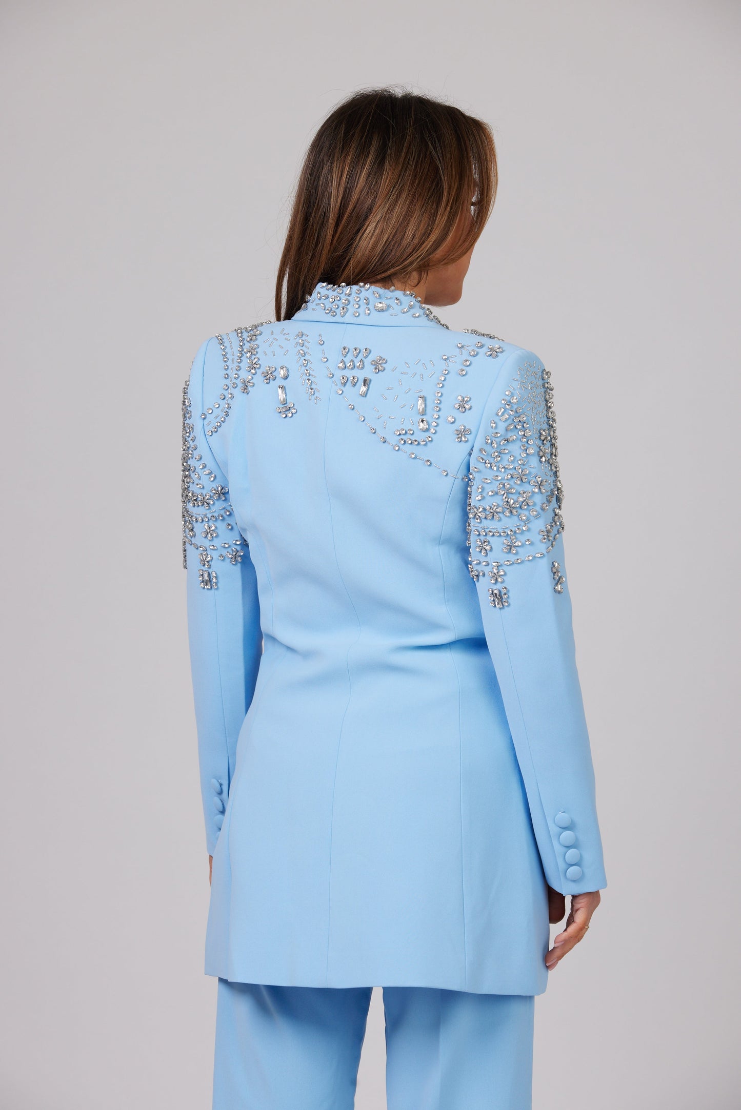 Vous allez tomber amoureux de notre BLAZER CRISTAL AZURE à simple boutonnage en ÉDITION LIMITÉE, doté d'épaules rembourrées définies équilibrées par la taille fine et incrusté de cristaux scintillants de différentes tailles qui scintillent lorsqu'ils captent la lumière.