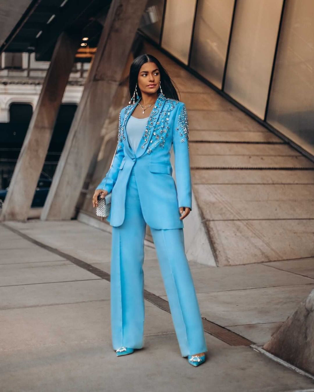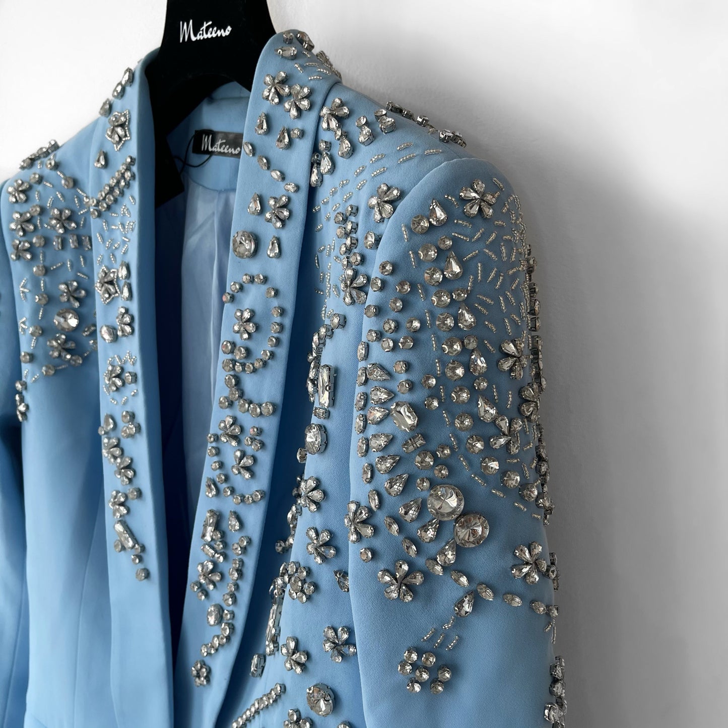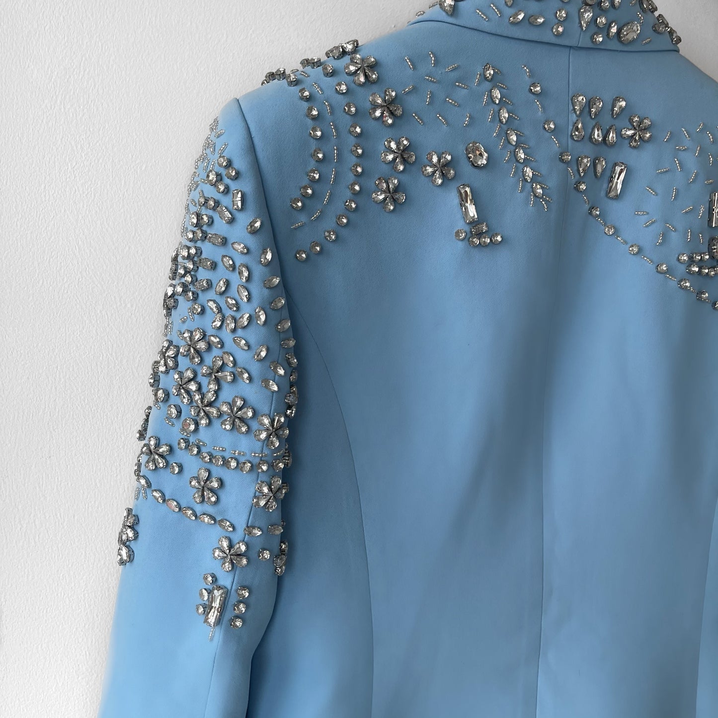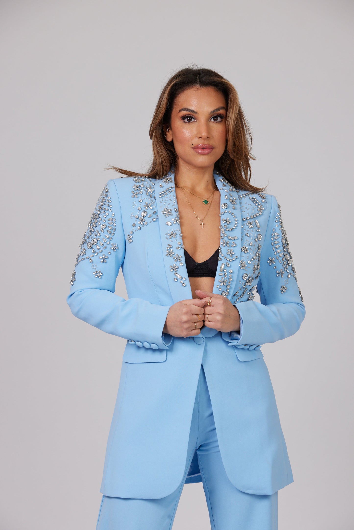 Vous allez tomber amoureux de notre BLAZER CRISTAL AZURE à simple boutonnage en ÉDITION LIMITÉE, doté d'épaules rembourrées définies équilibrées par la taille fine et incrusté de cristaux scintillants de différentes tailles qui scintillent lorsqu'ils captent la lumière.