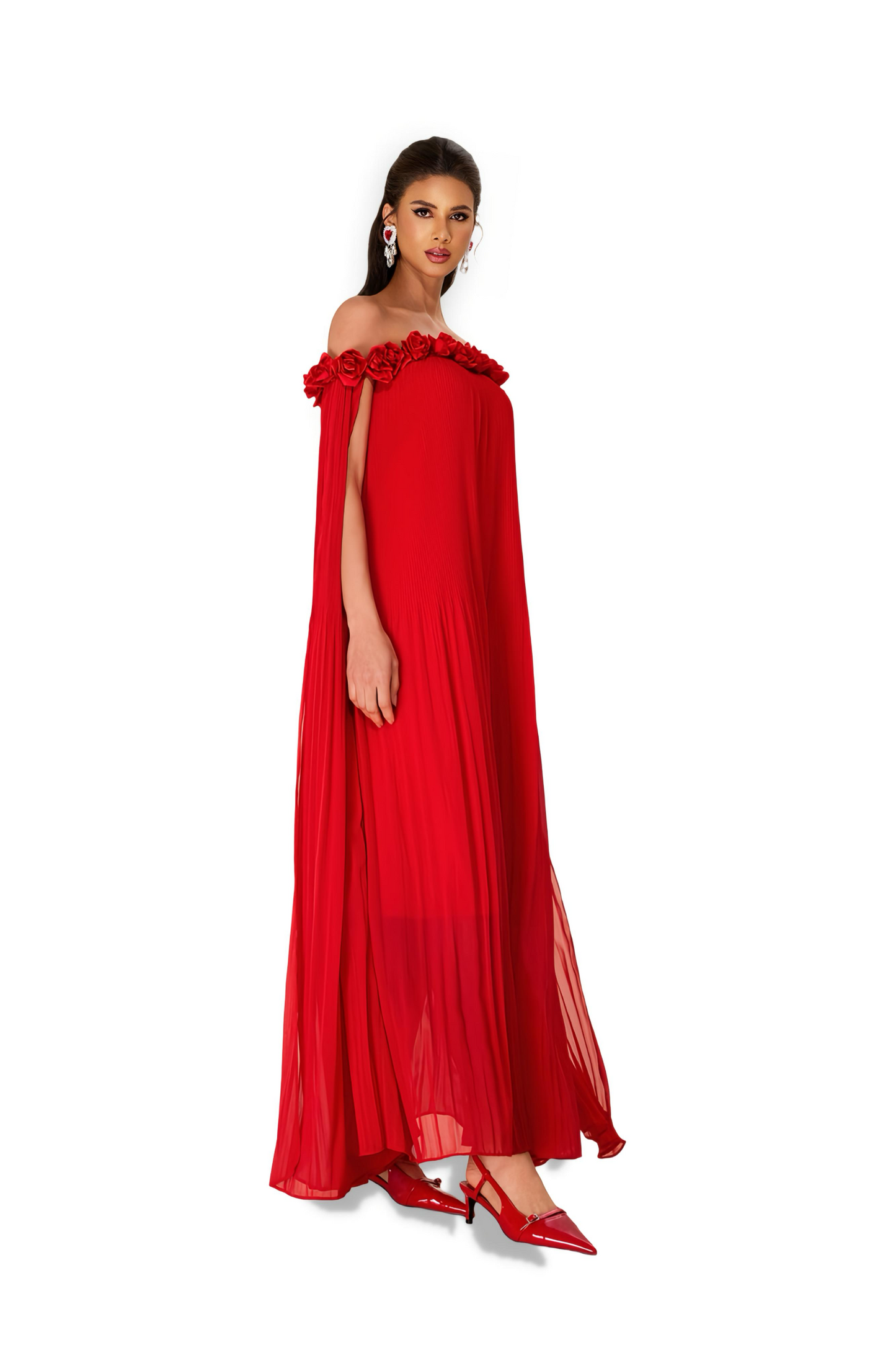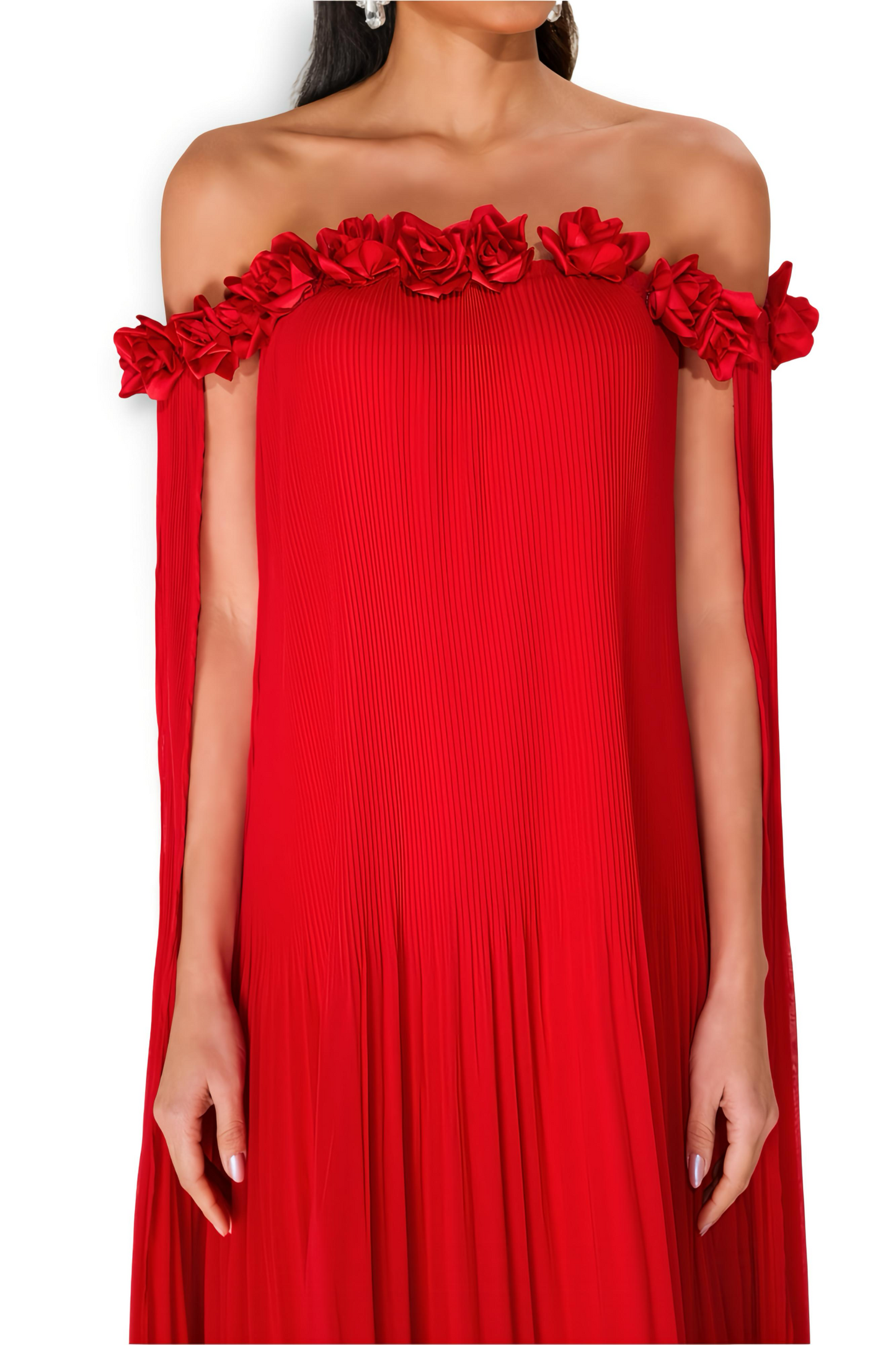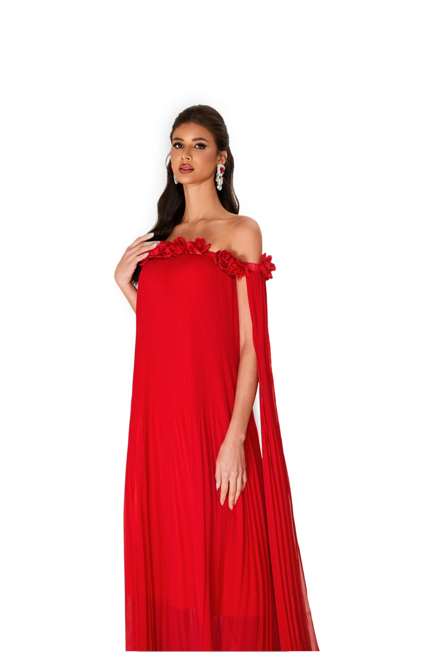 Command attention in our show-stopping Ruby Floral Dress – a timeless piece designed to make an unforgettable entrance. This off-the-shoulder gown features a beautifully pleated chiffon silhouette that flows effortlessly with every step. The neckline is adorned with hand-stitched 3D floral appliqués, adding a romantic and couture touch to the rich ruby red hue. Elegant draped sleeves fall gently from the shoulders, creating a cape-like effect that enhances the dress’s ethereal charm. Perfect for galas, weddings, or red carpet moments, the Ruby Floral Dress is a true statement of sophistication, femininity, and power. Key Features: