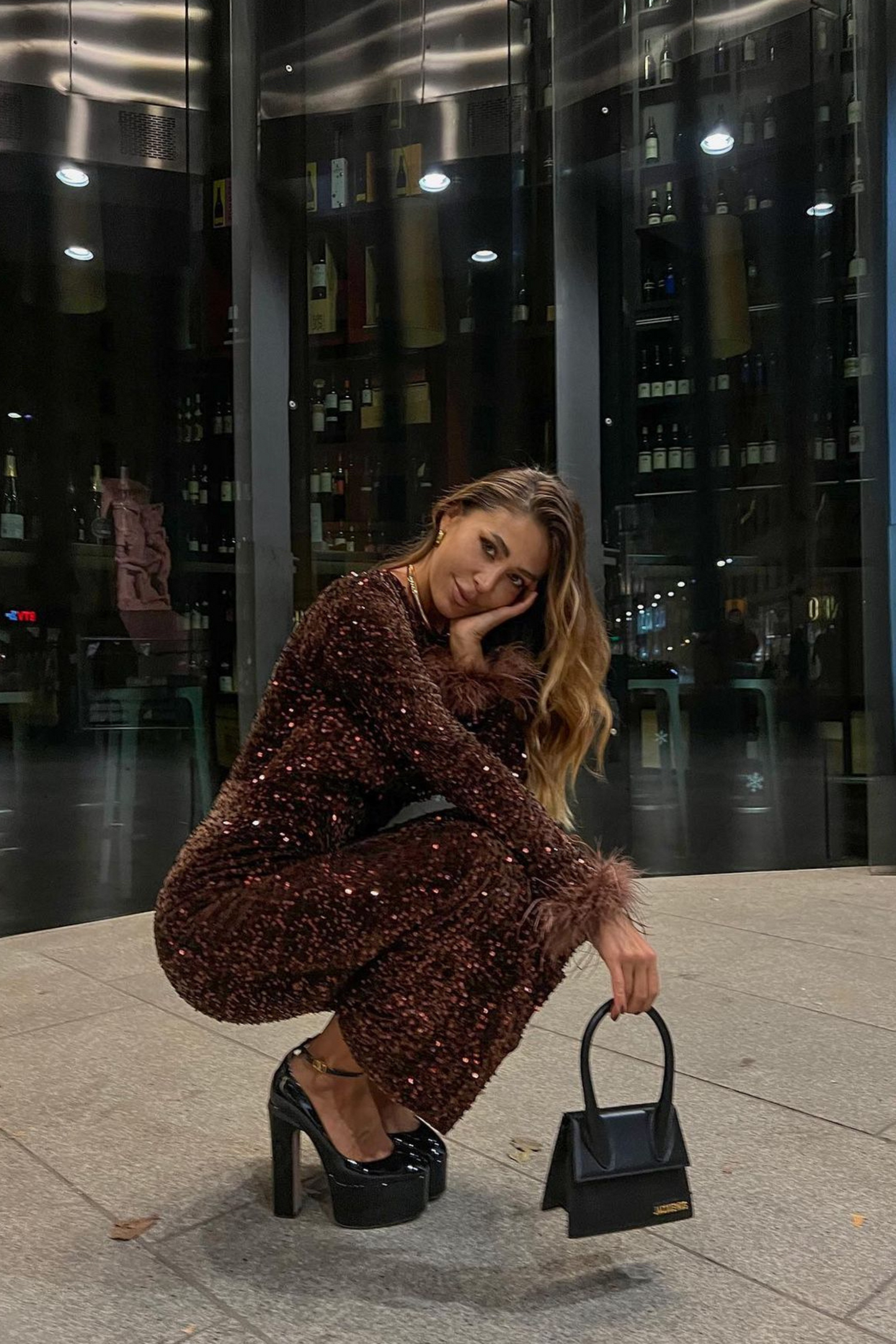 Introducing our stunning DARINA BROWN SEQUINNED DRESS, the epitome of elegance and glamour for the winter festive season. This dress is meticulously crafted with premium velvet sequins that shimmer and catch the light, creating a mesmerising effect. Its rich brown cacao colour adds warmth and sophistication, making it an ideal choice for any special occasion. The dress features a flattering silhouette that accentuates your curves, while the long sleeves provide both comfort and a touch of modesty. Whether you're attending a holiday party or ringing in the New Year, this dress is guaranteed to turn heads and make a lasting impression.